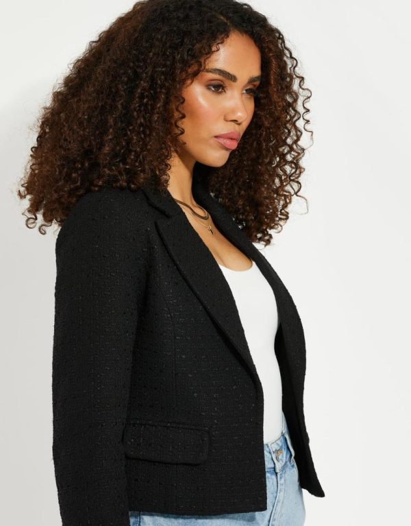 Bring a new edge to your look with our Threadbare short length blazer, in a gorgeous black tweed-look bouclé. Designed to suit your shape, the length hits the waist drawing in the eye, and the collar and lapel flatter the chest. Curved seaming on the chest adds shaping and padded shoulders add simple yet elegant volume in the right place. Two mini pockets perfect for your lipstick. Wear with leather look pants and a racerback crop top for night out glam, or for daytime pair with a striped tee and light blue denim.