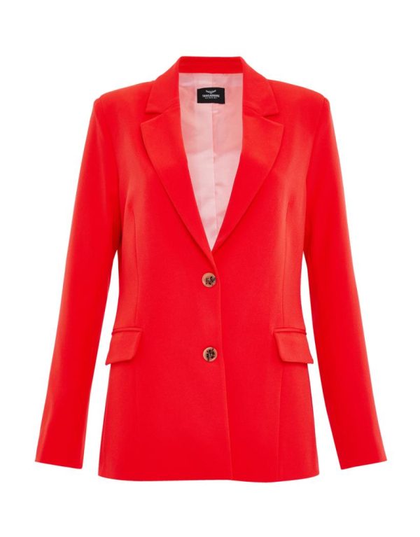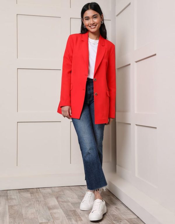 Add a touch of class to your look with our Parisienne feel blazer in a show stopping red. This oversized blazer with single breasted button fastening and notched lapel will skim your frame and add sophistication. Shoulder padding adds to the classic look, and it’s finished with darts to the sides of the bust for feminine shaping, two buttons and two pockets. Team with fitted jeans and a shirt for an understated glam look, or style it more casually with a knit underneath and loose ripped denim for a more London look. For workwear, team with a white shirt and ponte trousers for a fashion-forward ‘fit. A show stopper piece that your wardrobe needs this season and beyond. Perfect for statement party outfits with leather look trousers, and can be dressed down with blue denim and a simple white tee.