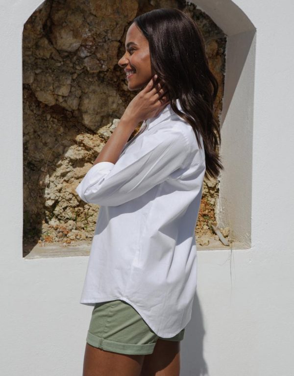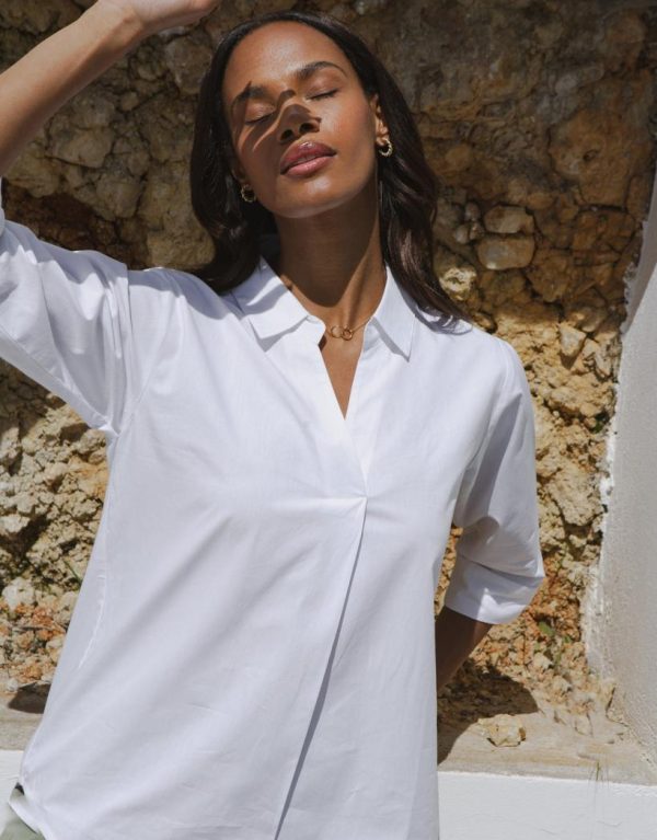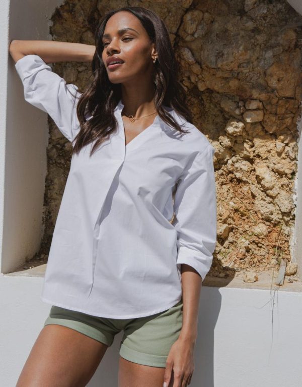 Casual summer settings call for a staple cotton poplin shirt. With an open stand collar and deep V neck that is finished with a pleated front, this shirt has bell styles sleeves with mock cuffs and in seam side pockets for easy, practical wear. Cut with a curved hem, the back is slightly longer for that enviable relaxed look. Pair with sandalsand denim shorts for a gorgeous summer outfit that’s perfect abroad or at home in a heatwave.