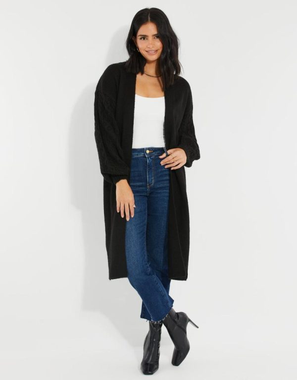 Finish your outfit with a gorgeous new knit: our Threadbare longline cable knit cardigan. With cable knit to the sleeves, this knitted cardigan has a dropped shoulder and full knitted cuffs for a snug look. The hem is split at the sides to give movement for a relaxed feel. Layer over tees with jeans for a casual vibe, or add over a slim fit midi dress for the perfect office warmer.