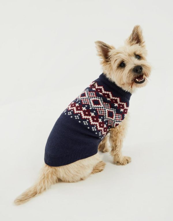 Kit your pup out with our essential winter jumper, with stylish fairisle print. With navy ribbed neck and navy ribbed hem, this jumper has a fairisle print to the upper section and a navy lower section. Comes on a branded Threadpaw hanger. Perfect for keeping them warm and cosy on cooler days.