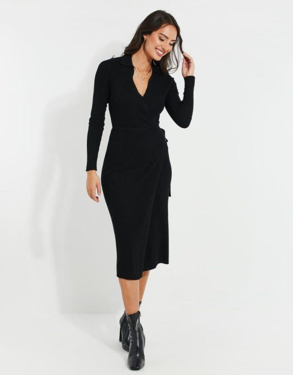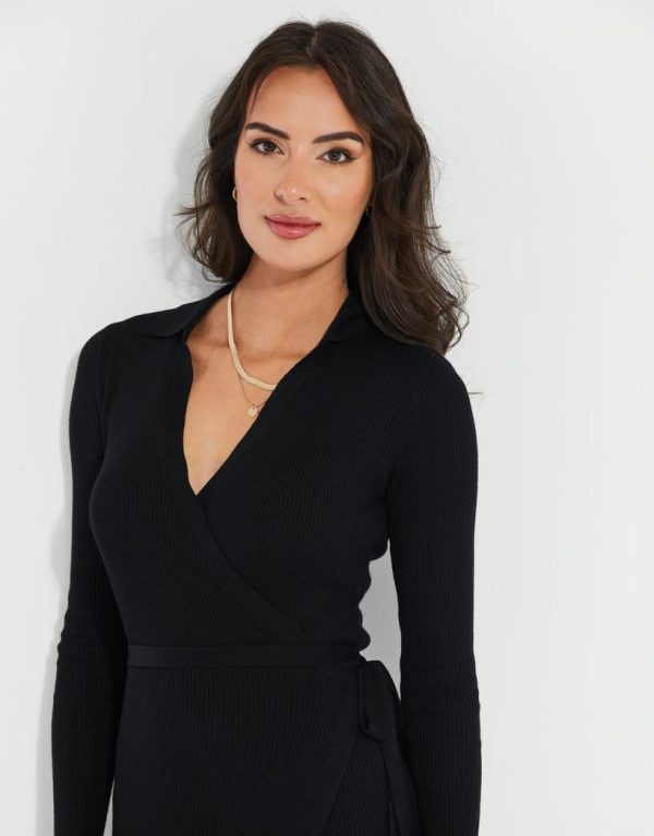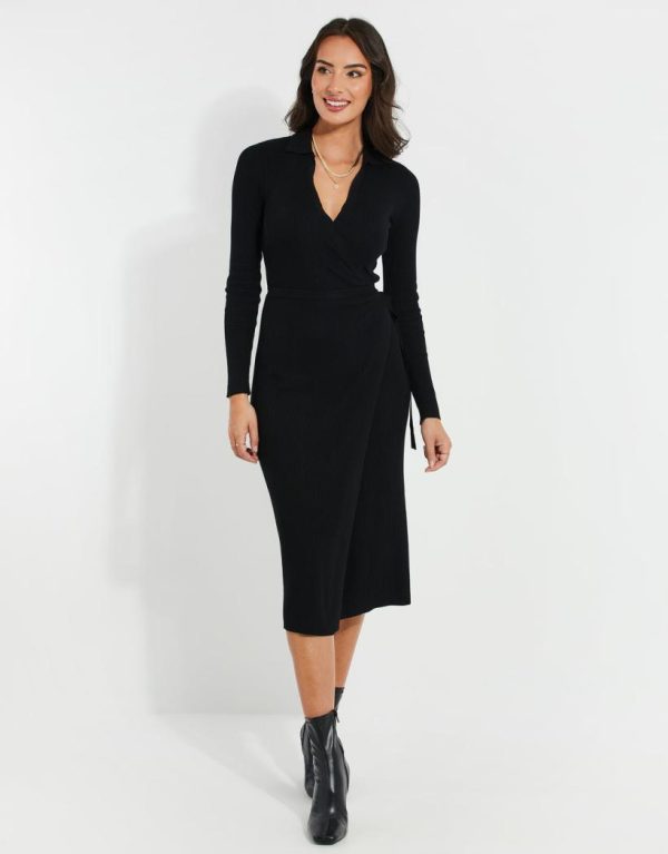 Channel feminine power in our Threadbare wrap dress, an essential addition to your capsule wardrobe. In a fine rib knit made from a soft blend, you’ll be slipping into comfort without compromising on style. Cut in a slightly slim fit, this knit dress in classic jet black will show off your figure while cinching you in as it knots at the waist. A sultry V-neck is created and finished with a soft collar to flatter your neckline for a relaxed vibe that’s still haute fashion. Balloon-style sleeves finished with ribbed cuffs add stylish volume in the right places. Take on the day with a chunky trainer and a simple shacket, or style up for night with a biker jacket and patent heeled boots. Knitwear game strong.