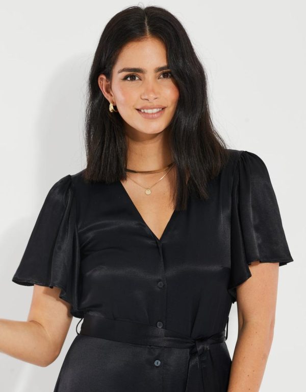 Threadbare Dresses | Women Black Satin Button Down Midi Dress
