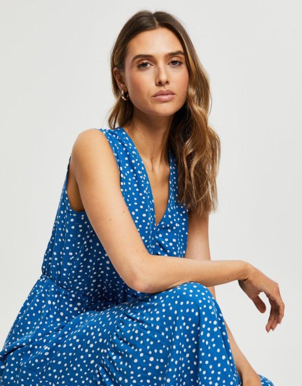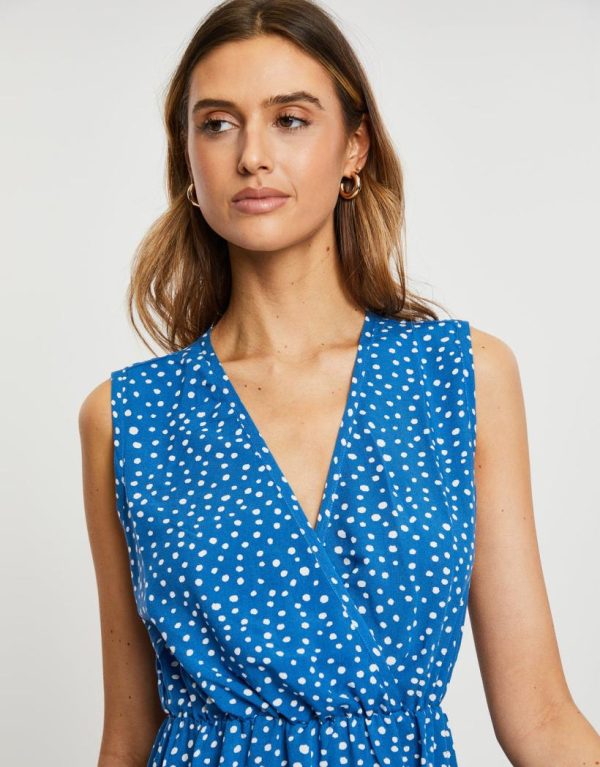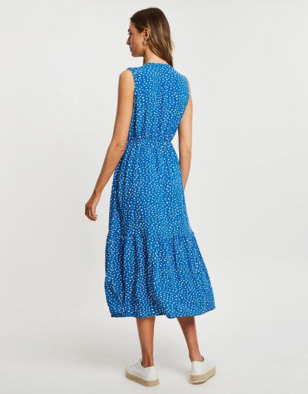 Chic and sophisticated, wear summer your way in this viscose sleeveless midi dress. In a blue and white fleck print, this elasticated waist dress has a non-functional wrap over to the top and a full skirt to create a gorgeous feminine flow. The dress drapes towards the hem to give you a summery breezy effect on your next getaway! Sleeveless with a V neck to the front and a crew neck to the back, this pretty fleck print dress is an elegant alternative to other printed dresses. Perfect on your next getaway paired with sandals and sunglasses, and can be lightly accessorised on hot days in the office for feminine workwear. For ultimate wedding guest attire, add colour pop or metallic accessories and prepare for the compliments!
