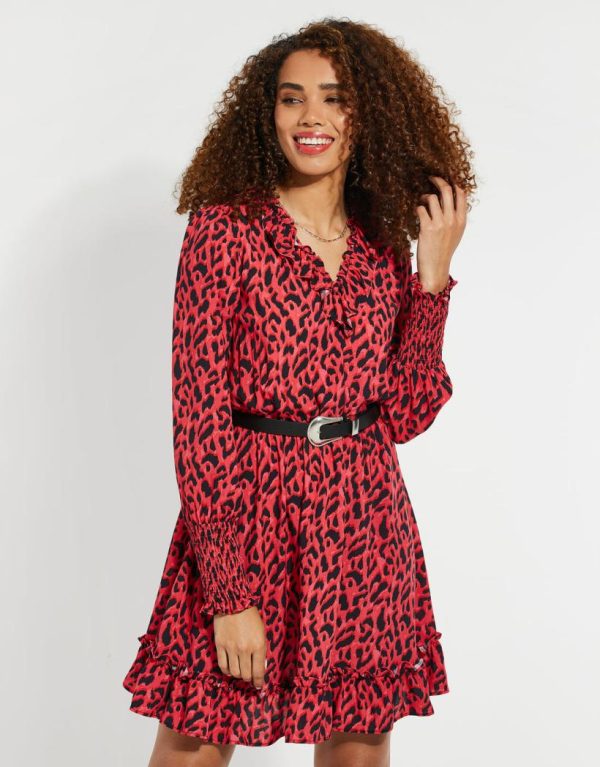 Bring edge to your outfit this season with our Threadbare animal print dress. With a ruffle v neck, full sleeves and elasticated cuffs to create a full sleeve, this mini dress is in a fit and flare shape with a frill panel. Attached PU belt is perfect for cinching in the volume, this cheetah print dress is easy to wear with a zip in the side seam. Add a heeled boot for a hot summer’s night, or add a denim jacket and white trainers for an effortless daytime look.