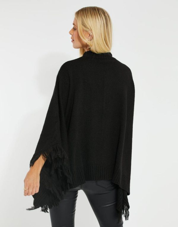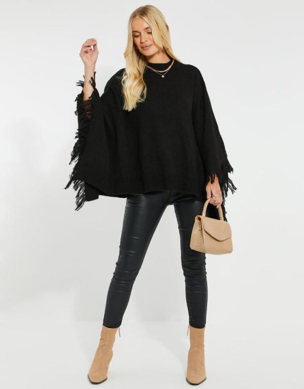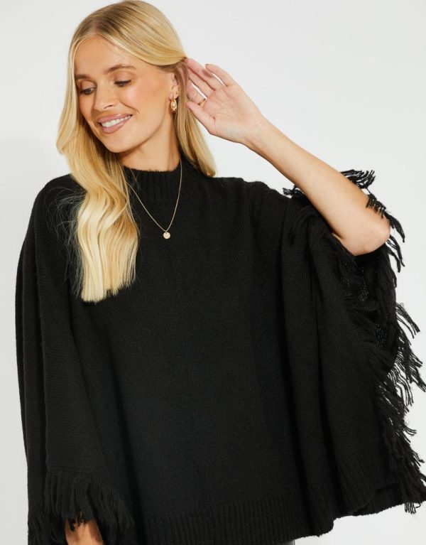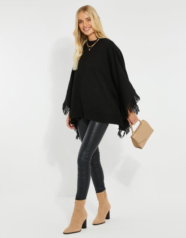 Threadbare Jumpers | Women Black Knitted Fringed Poncho