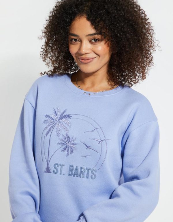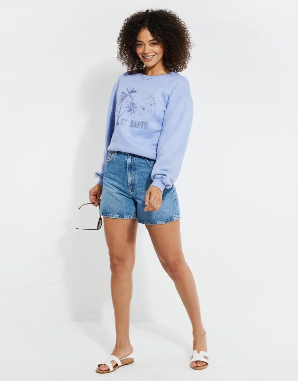 Look forward to lazy days with this pale iris blue slogan sweatshirt. With crew neck, cuffs and hem, this sweater has “St Barts” text with beach scene. A perfect loungewear piece or style with jeans for casual weekend activities.