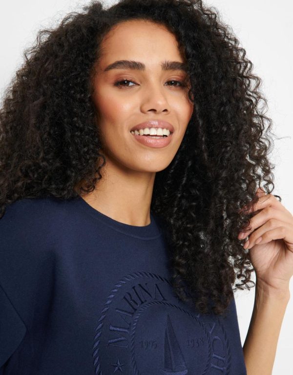 Look forward to lazy days with this slogan sweatshirt in mood indigo. With crew neck, cuffs and hem, this sweater has “Marina Yacht Club” text and sail boat graphic. A perfect loungewear piece or style with jeans for casual weekend activities.