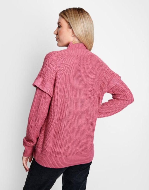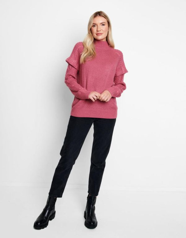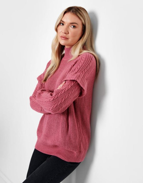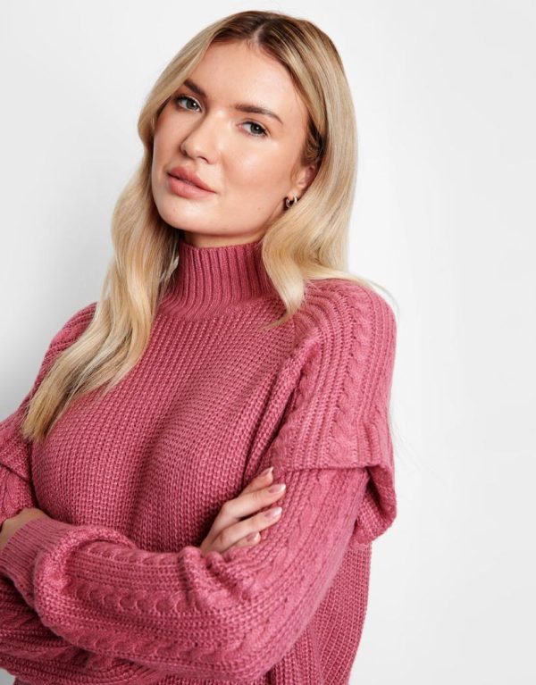 Elevate your knitwear collection with our knitted jumper. The perfect lightweight style for spring that will still look cute in winter. With a turtle neck and cut in a regular fit, this easy-to-style jumper has sleeve frill detail creating a different silhouette to other knitwear pieces. The sleeves are in a contrast cable knit adding interest to a regular jumper. Transition into the spring season by french-tucking this jumper into a midi skirt, paired with biker boots and a leather jacket.