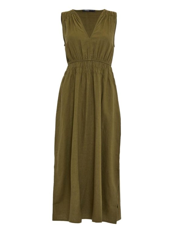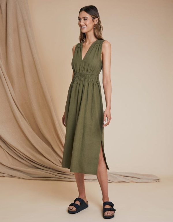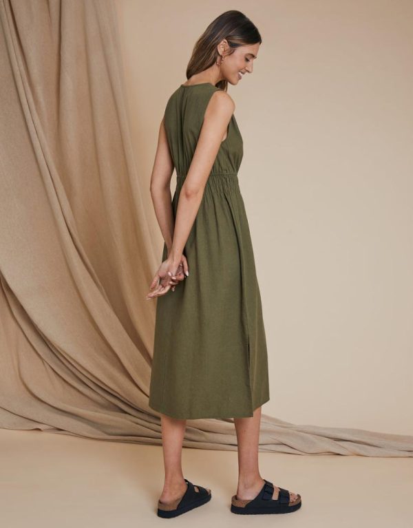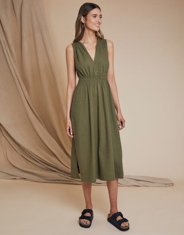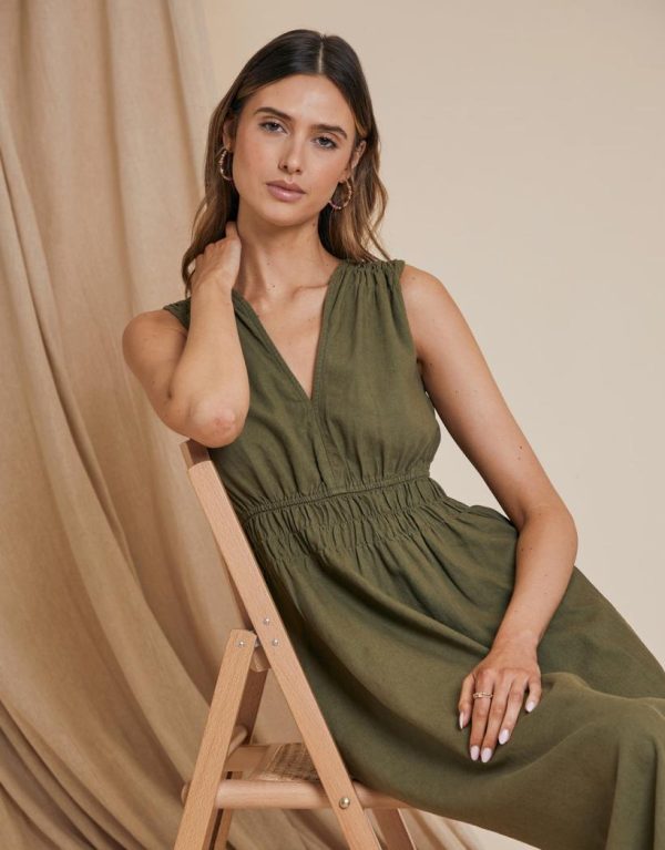 Channel Riviera vibes with our Threadbare olive green ruched waist midi dress. With a ruched, cinched in waist and deep V-neck, this midi dress has fullness in the skirt and a ruching effect on the shoulders for elevated detail. Being sleeveless, it’s an easy throw-on dress for warmer weather. Made from a linen and viscose blend, making it perfect for easy summertime wear. Team with a pair of espadrilles and sunnies and you’ll be looking like a true jetsetter.