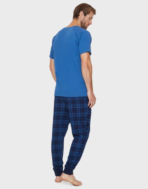 Lounge in comfort with this two piece pyjama set from Threadbare. This piece set contains a short sleeve cobalt blue cotton t-shirt with raglan sleeves, round neck and Threadbare embroidery on the chest, and long pants are check flannel with elasticated waistband and branded drawcords. Perfect for lounging about the house or for sleeping in.
