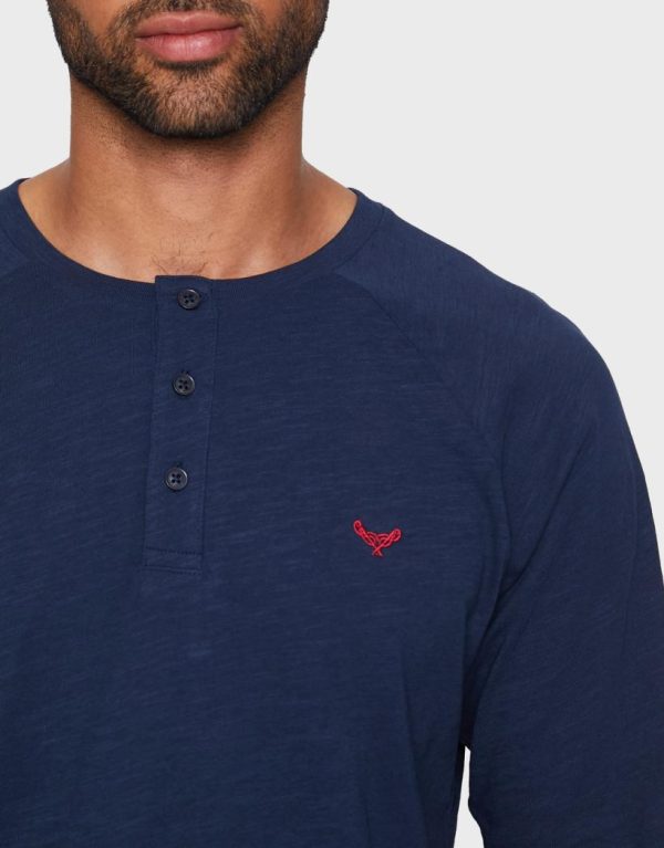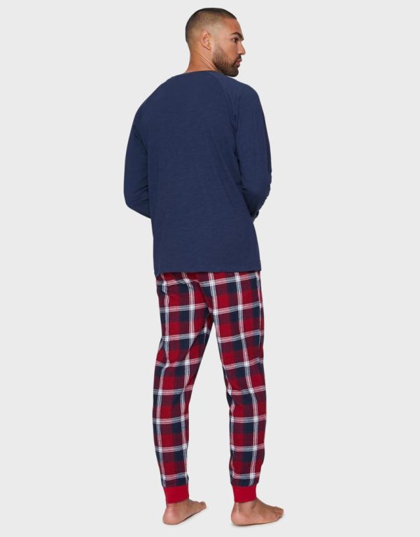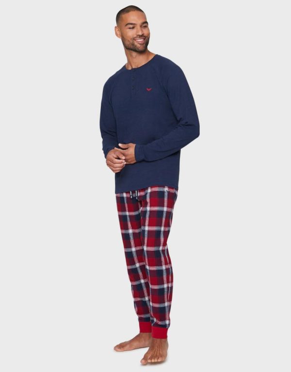 Lounge in comfort with this two piece pyjama set from Threadbare. This piece set contains a long sleeve cotton t-shirt with raglan sleeves and buttoned neck, and long pants are check flannel with elasticated waistband and branded drawcords. Perfect for lounging about the house or for sleeping in.