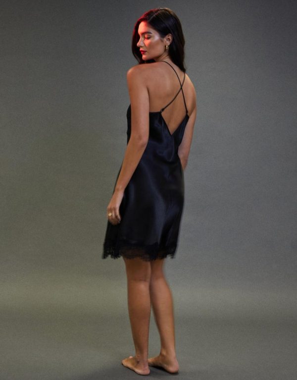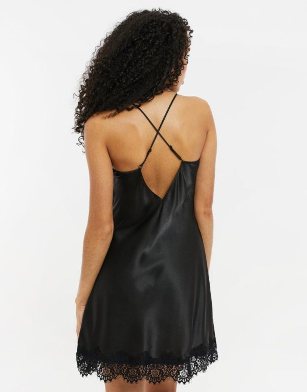 Bring some sultry glam to your nightwear with this sumptuous black satin cami night dress. Knee length and cut in a regular fit, this cami dress has a soft v-neck, gorgeous black lace under the bust and a lace trim on the hem for an appealing finish. The criss-cross back is a feminine feature that will suit all body types. Pair with our satin dressing gown for a luxurious co-ord.