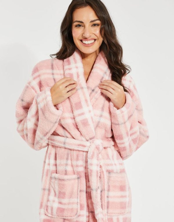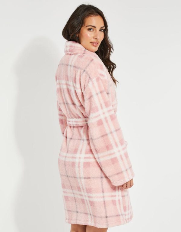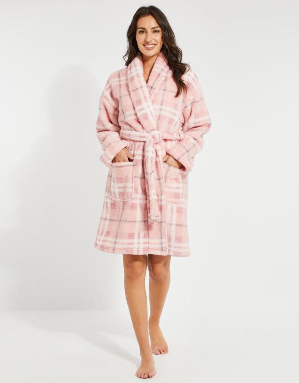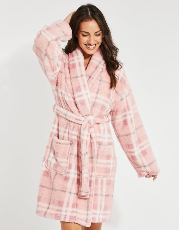 Cosy nights in call for this Threadbare check print dressing gown. Cut in a regular and relaxed fit, this nightwear robe has a self tie waist belt and open revere collar for cosy effect. Finished with two pockets for extra snugness and cut above the knee for ease of movement. Be cute and comfy by putting this on over your usual nightwear to bring warmth on cooler mornings.