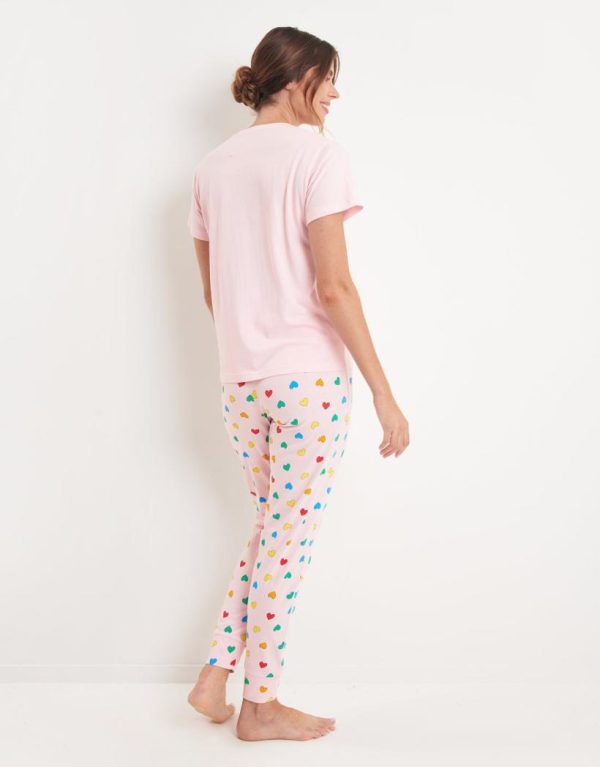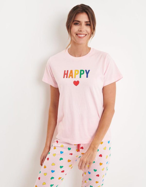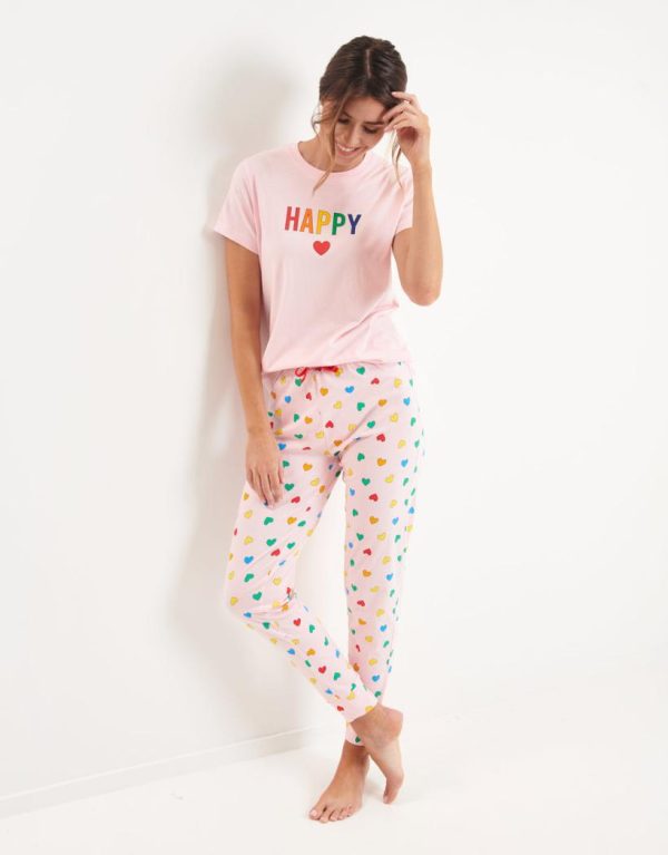 Brighten up your nights and bring positive vibes with our Threadbare two piece pyjama set. Cut in a regular fit, these pyjamas feature a short sleeve pink t-shirt with ‘Happy’ text and heart graphic, and matching long pink in all-over rainbow coloured heart print with an elasticated waistband and red drawcords. Cute enough to lounge about in on the weekend too. Also make a gorgeous gift for a loved one.