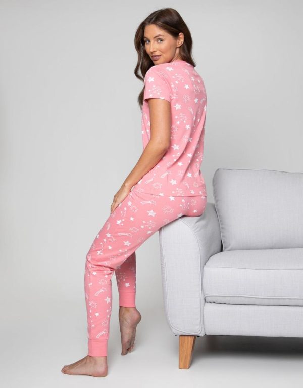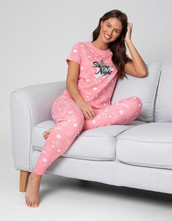 Style up your nights in with this loungewear set. Features short sleeve top with star print finished with foiled detail, and pyjama pants with elasticated waist, drawcord and matching star print top. Also available in blue.