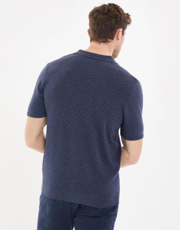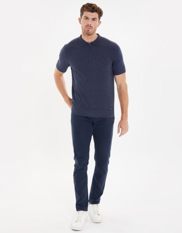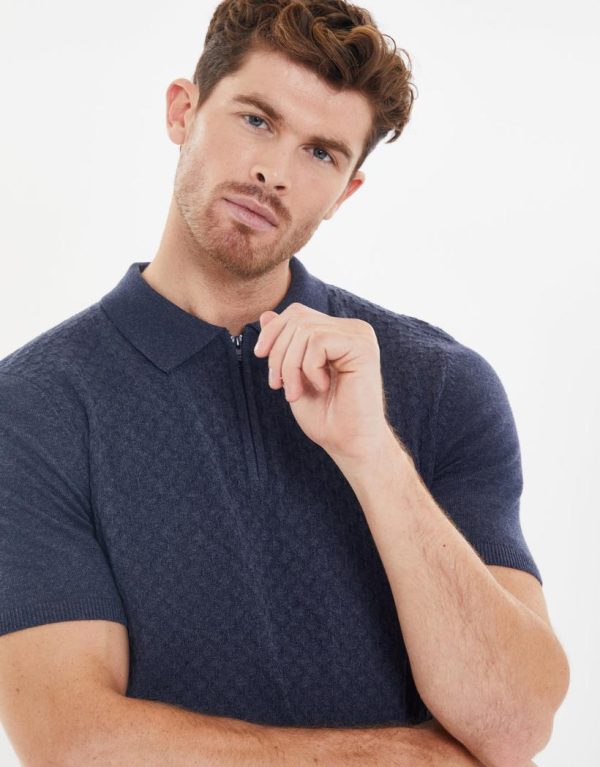 Threadbare Polo Shirts | Men Navy Marl Textured Quarter Zip Knitted Polo