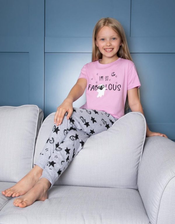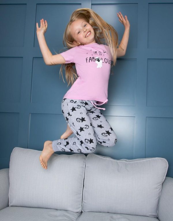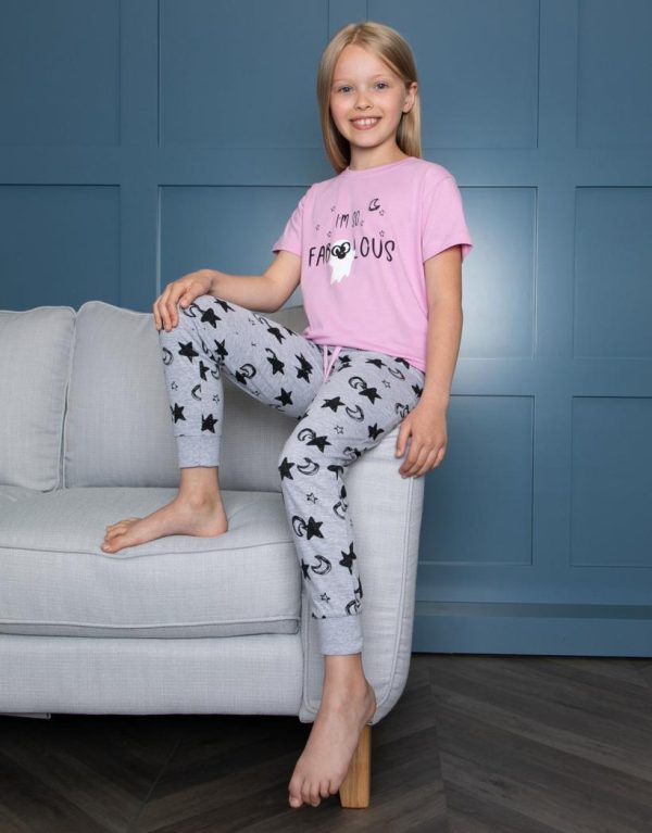 They’re going to look fa-boo-lous in this Threadgirls Halloween themed loungewear set. Includes short-sleeve top and full-length pyjama bottoms, both made from soft 100% cotton to keep them comfy and easy to wash for you. Top has elasticated crew neck, with Ghost and “I’m so Faboolous” graphic print; tapered bottoms have elasticated waistband with drawcord, and all-over star and moon print.