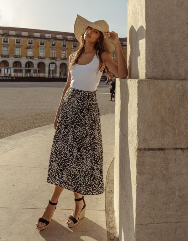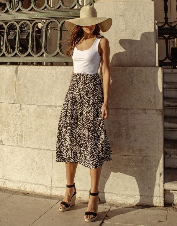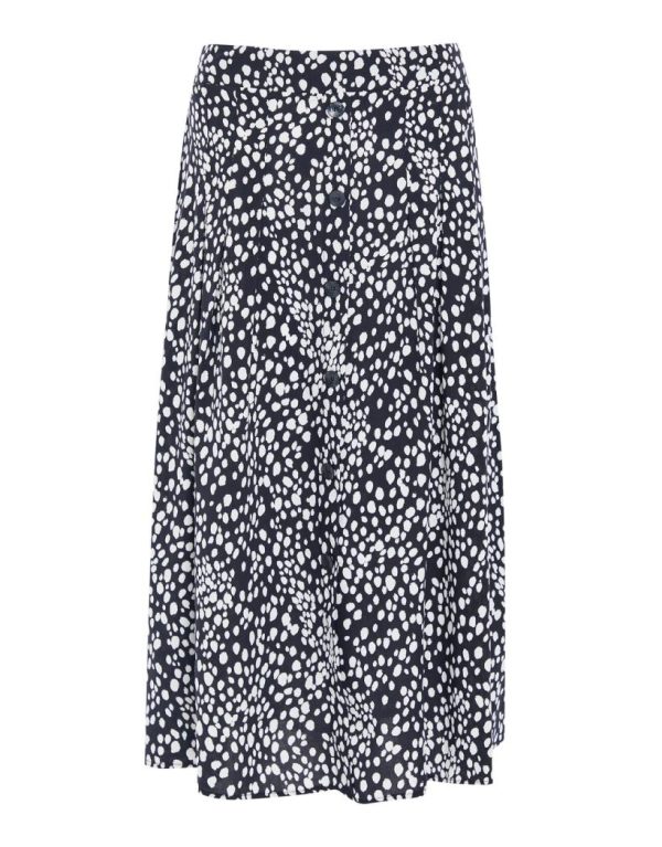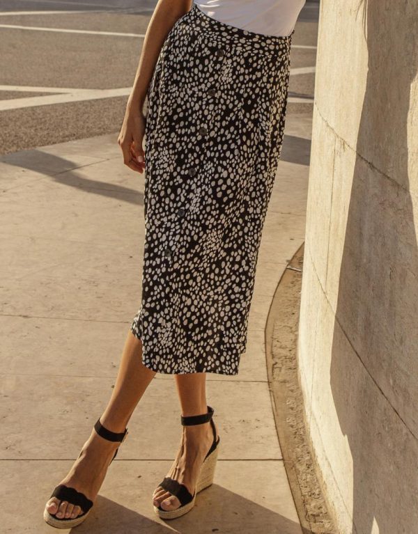 Add a new level of pretty to your summer wardrobe with our Threadbare printed button down detail midi skirt. This midi skirt has a non-functional button down detail and lots of fullness in the skirt to create movement. The waistband is elasticated at the back and flat at the front for a comfortable fit that flatters your shape. The stylish all-over abstract polka dot print is a fabulous alternative to standard polka dot prints. Finished with a wide hem for that gorgeous movement you’re after in the spring and summer months. Style with a simple white or black tee and a trainer on the weekend for an easy and effortless look, or team with a simple fine knit, faux leather biker jacket and strappy heels to dress it up.